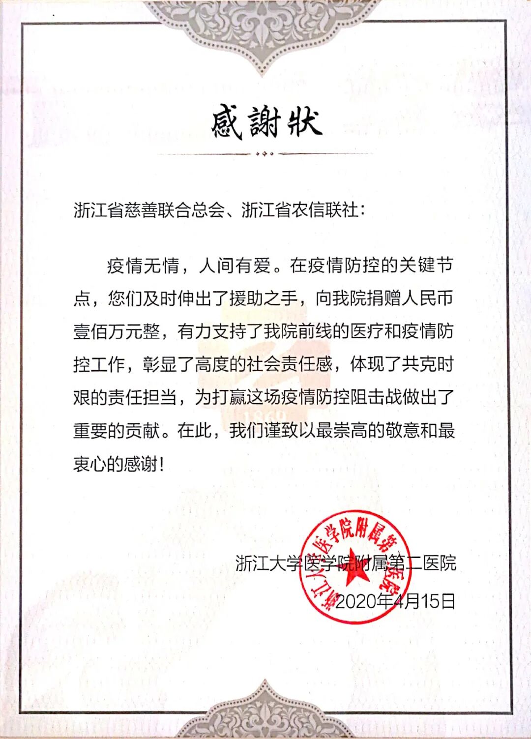浙大二院向省慈善联合总会、省农信联社递交感谢信。